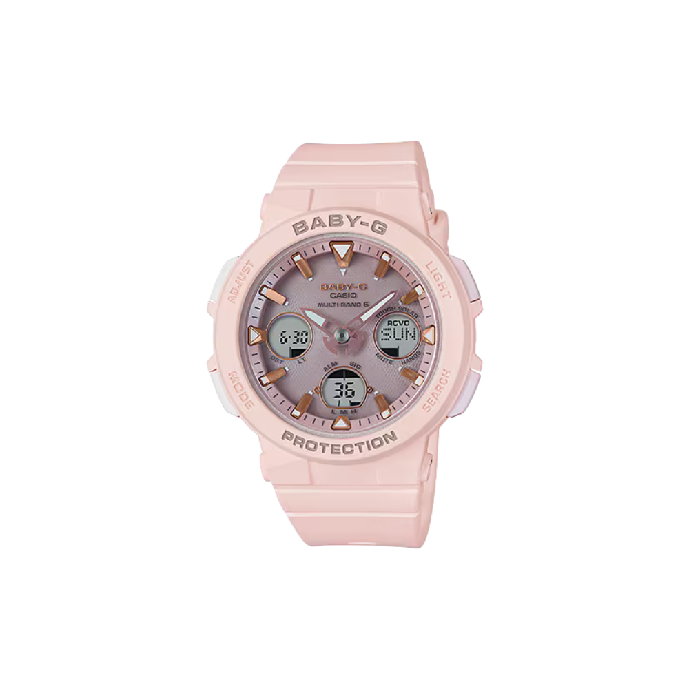また、ライトを点灯すると、時分針がピンクや緑に光り幻想的な夜の海を連想させます。マルチバンド6、ワールドタイム、タフソーラー等、頼れる機能も備えたBABY-Gです。