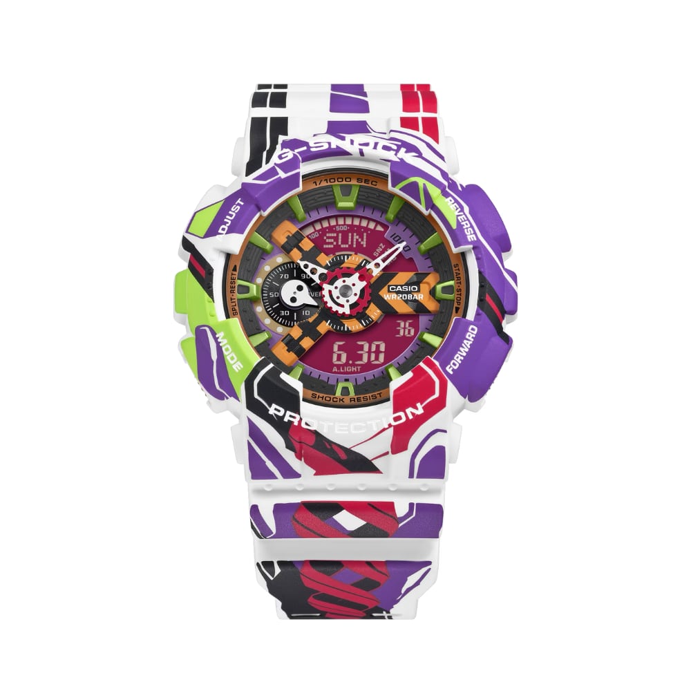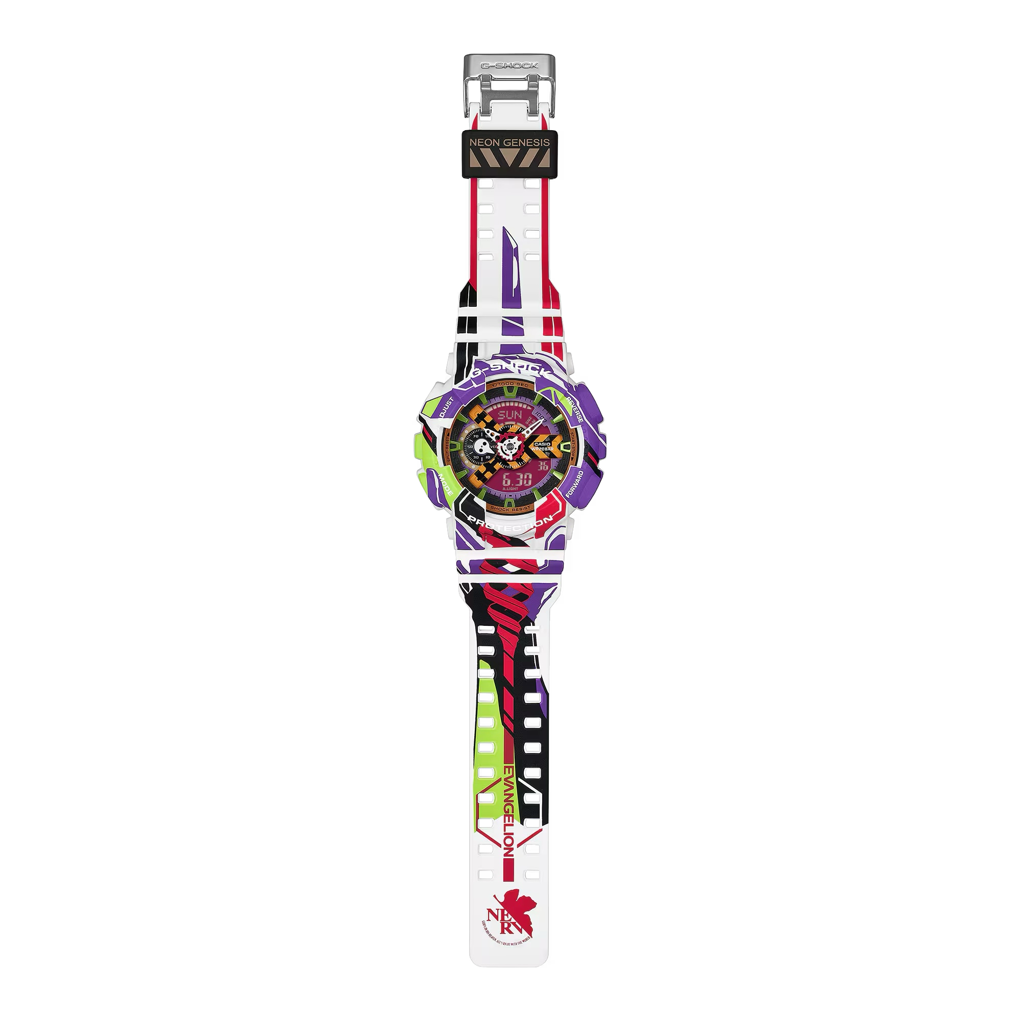 G-SHOCK全体にエヴァンゲリオン初号機が描かれ、12時側のバンドには初号機の頭部装備である角、ベゼル部分には初号機の顔、ベゼル下部から6時側のバンドにかけてはロンギヌスの槍を投擲しようとする左腕がデザインされています。