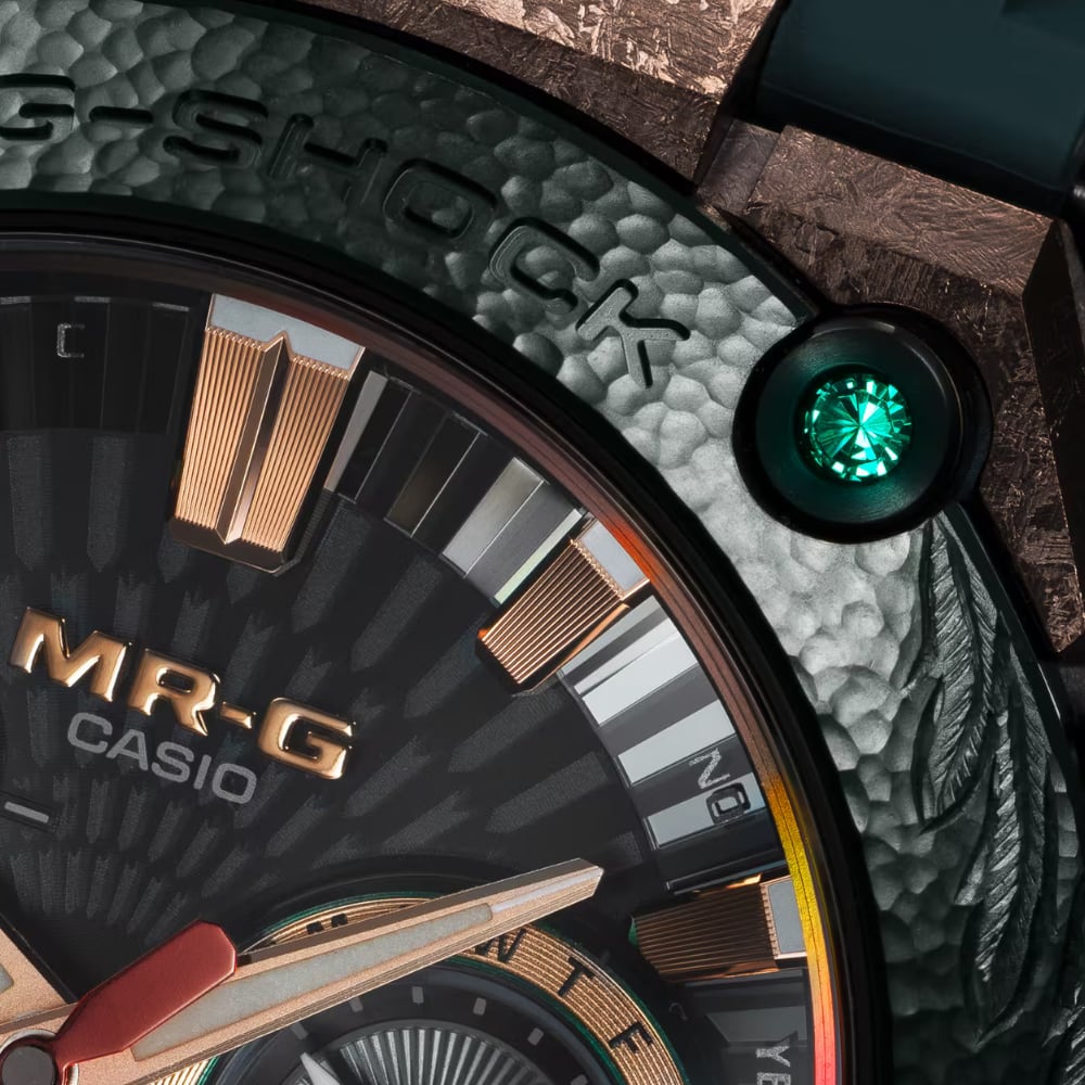 ベゼルの色は、鉄を高温で焼いた時に現れる「鐵色(くろがねいろ)」を表現。さらに、精神的な強さを与えると言われるエメラルドをベゼルのビス4箇所にセット。重厚感の中に華やかさを与えています。