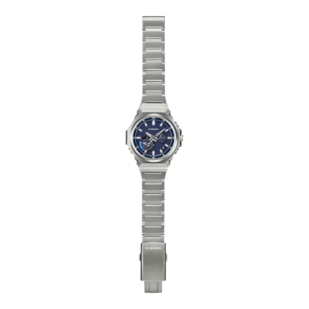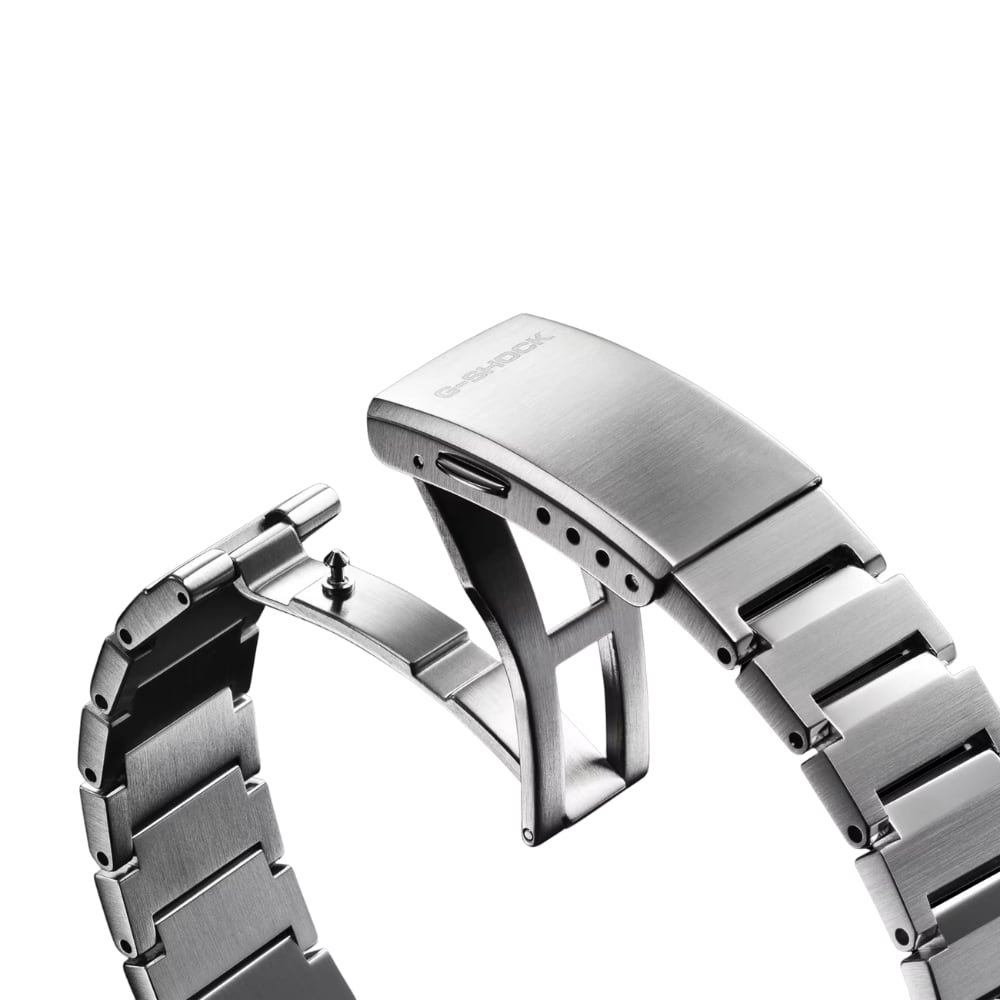 ロゴを排したベゼルは光の角度で表情を変え豊かな質感を演出。ステンレススチール製のバンドにはヘアライン仕上げとミラー仕上げを施し、三つ折れ式中留は端正なデザインとホールドが魅力です。