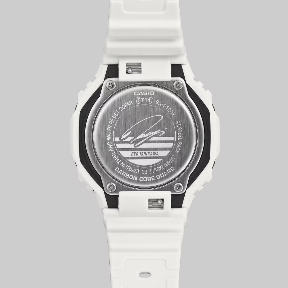 ベースモデルはオクタゴンベゼルのGA-2100で、ゴルフスイング中も邪魔にならない薄型ケースを採用。文字板には闘志を秘めた冷静のブルー、全体は潔さと覚悟を表すホワイト、差し色には希望を意味するオレンジを配色し、どんなゴルフウェアにも合わせやすいカラーリングに仕上げました。また、文字板はスケルトンを採用することで、今までにない印象的なデザインとなっています。石川遼選手のサインを12時位置と裏蓋に施し、トレーディングカードが付属したスペシャルパッケージと合わせ、特別な仕様となっています。