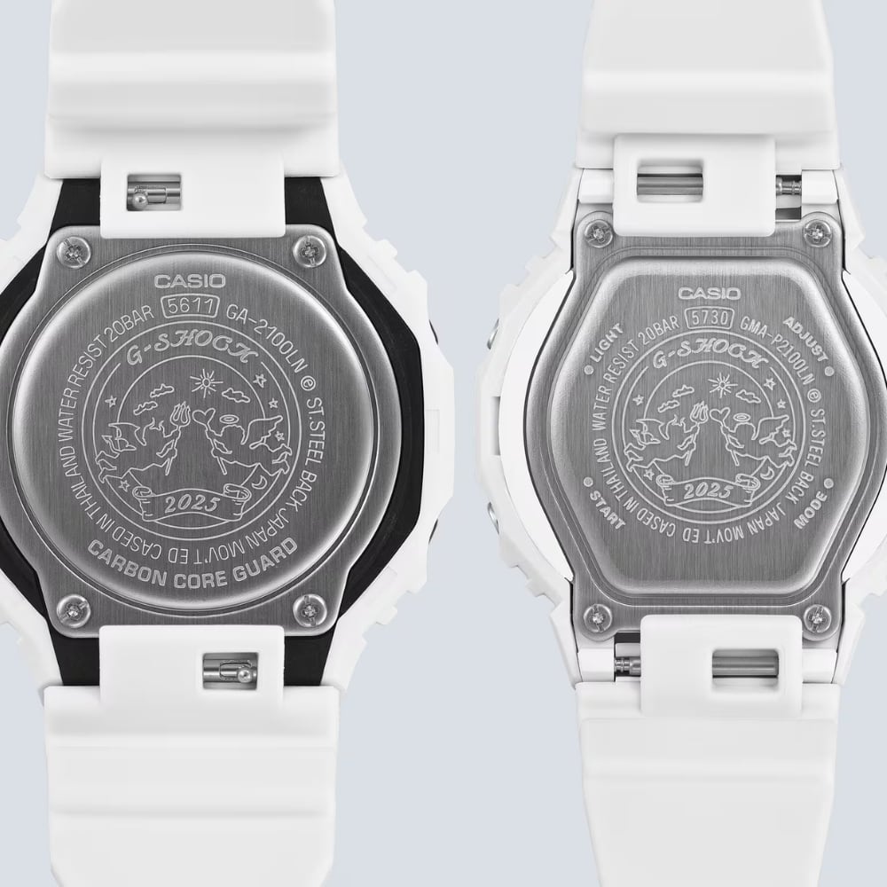 ダイアルに透明蒸着を施し質感を高め、インデックスにはブルー蒸着を施し、シルバー・ゴールドの差し色がクリスマスの華やかさを演出。マットホワイトのベゼルとバンドに、G-SHOCKロゴおよびアワーマーカーのゴールドが特別感を添えます。裏蓋にはラバーズコレクションのシンボル「天使&悪魔」を刻印。大切な人との絆を見守ります。