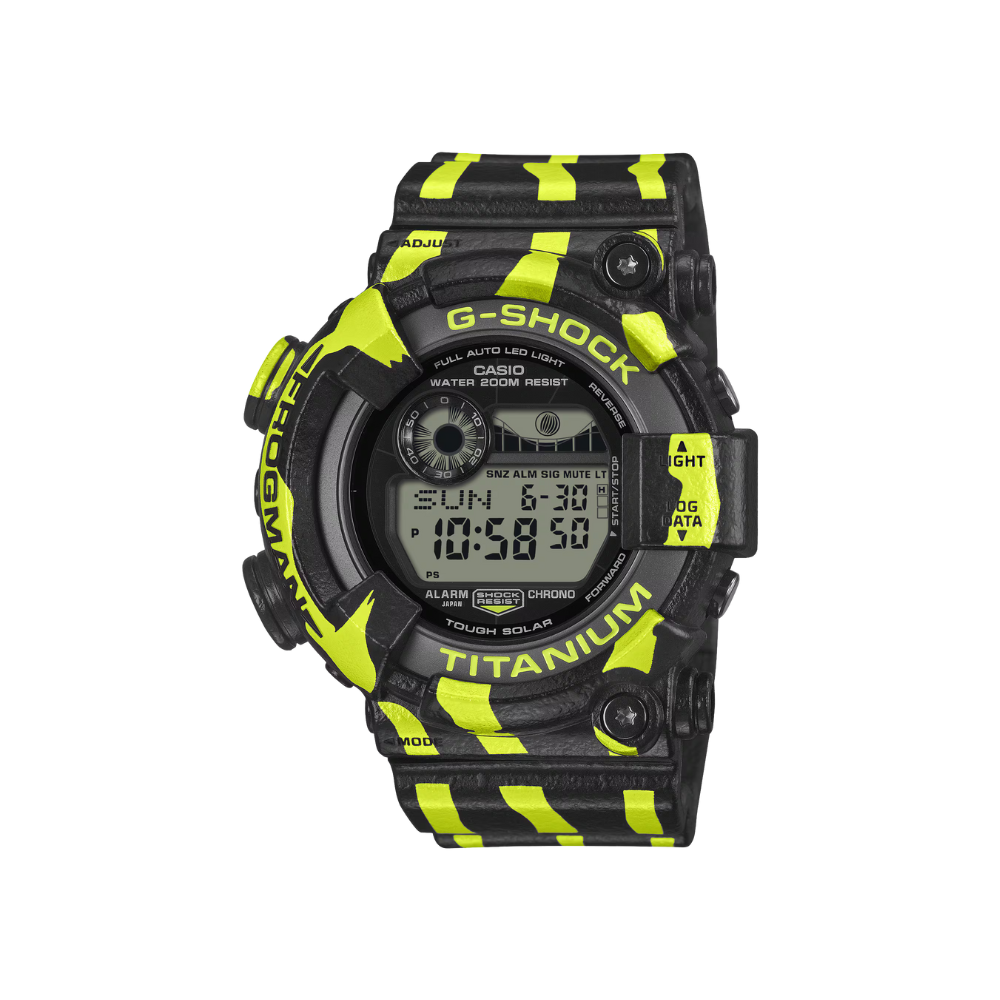 ブラックベースに大胆な蛍光グリーンの縦縞模様を施し、ミスジヤドクガエルの強力な毒性を象徴する鮮やかでタフなデザインに仕上げました。でこぼこの皮膚の質感はバンドとベゼルへのスプレー塗装で再現。さらに、ケース裏のカエルのキャラクター刻印もミスジヤドクガエルの縦縞模様を纏った特別仕様に仕上げています。タフソーラーを備え、蛍光灯のわずかな光でも発電し強負荷のかかる各種機能を安定駆動。定期的な電池交換の手間を省きます。