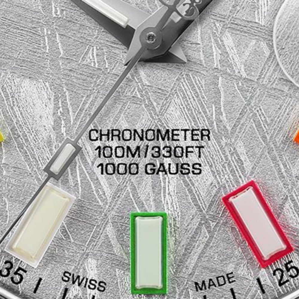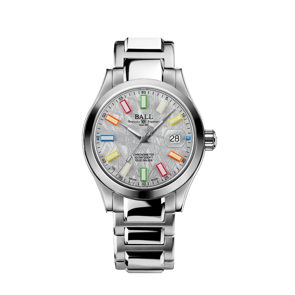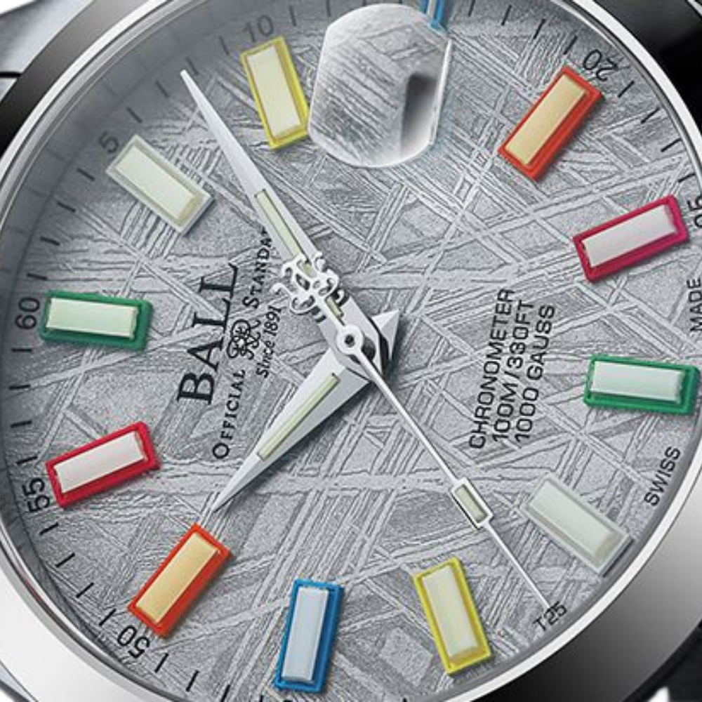 ボール ウォッチの人気モデル「マーベライト クロノメーター」に、地球上に存在しない物質「メテオライト(隕石)」を文字盤素材として採用したとても神秘的なモデルが新たにラインアップに加わりました。このモデルの文字盤に使用しているメテオライトはムオニオナルスタ隕石と呼ばれ、北極圏に近いスウェーデンとフィンランドの国境近くにあるムオニオ川周辺で1906年に発見され、最も古い隕石の一つとして歴史的に重要な天体物質です。地球外物質であることから希少性がとても高く、さらに模様も同じものがないため一点もののプレミアム感が満載です。もちろん、ボール ウォッチを代表するモデル「マーベライト クロノメーター」ですので、文字盤や針に自発光のマイクロ・ガスライトを搭載、スイスC.O.S.C.認定クロノメーター仕様のムーブメント 、ケース素材には最高級の904L ステンレススティール、ミューメタル製インナーケース内蔵による80,000A/mの耐磁性能、そして5,000Gsの耐衝撃性など「シビアな環境でこそ必要とされる機能性」を有しています。