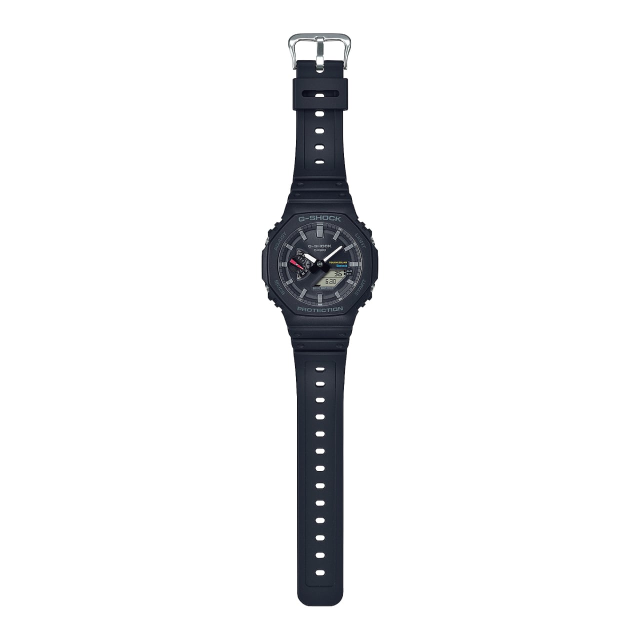 初代G-SHOCKのデザインコンセプトを受け継いだGA-2100の八角形フォルムはそのままに、スマートフォンリンクとタフソーラーを搭載しました。高機能化に伴う部品点数の増加に対応するため、基板配置を最適化した薄型モジュールを新しく開発。カーボンコアガード構造と組み合わせることで、従来モデルのサイズ感をキープしています。